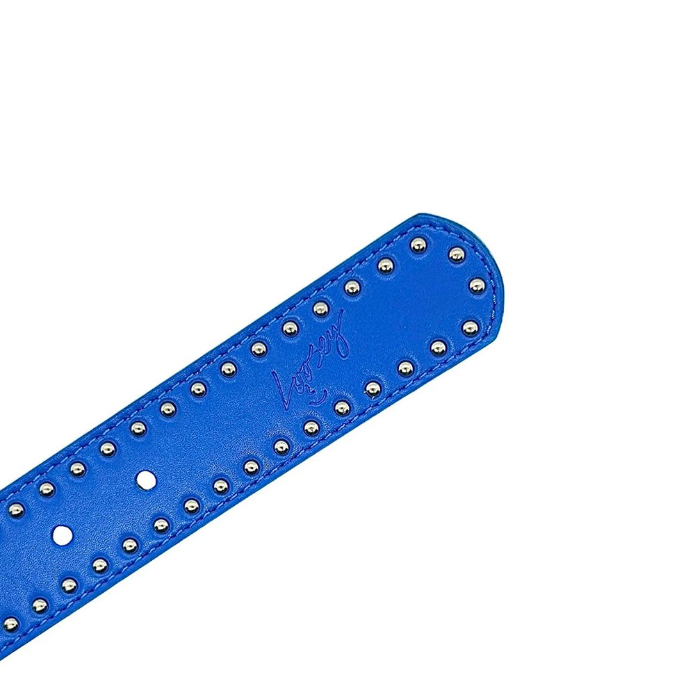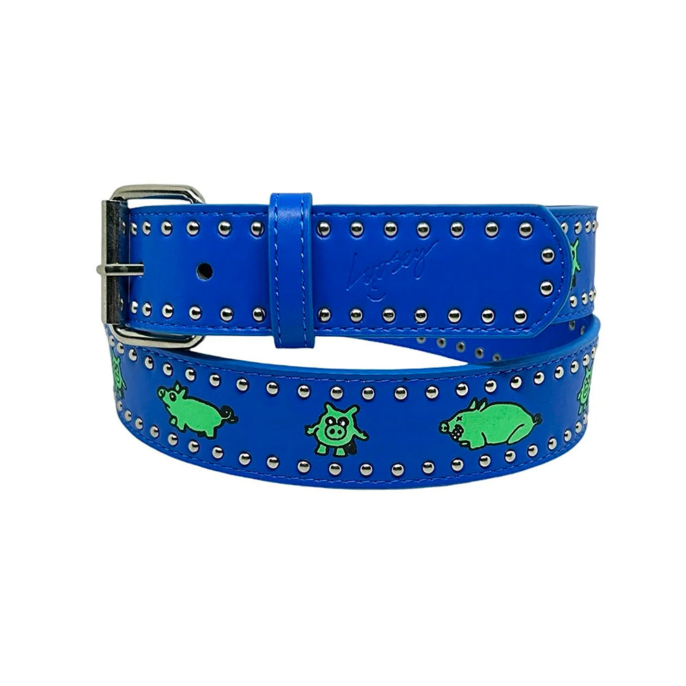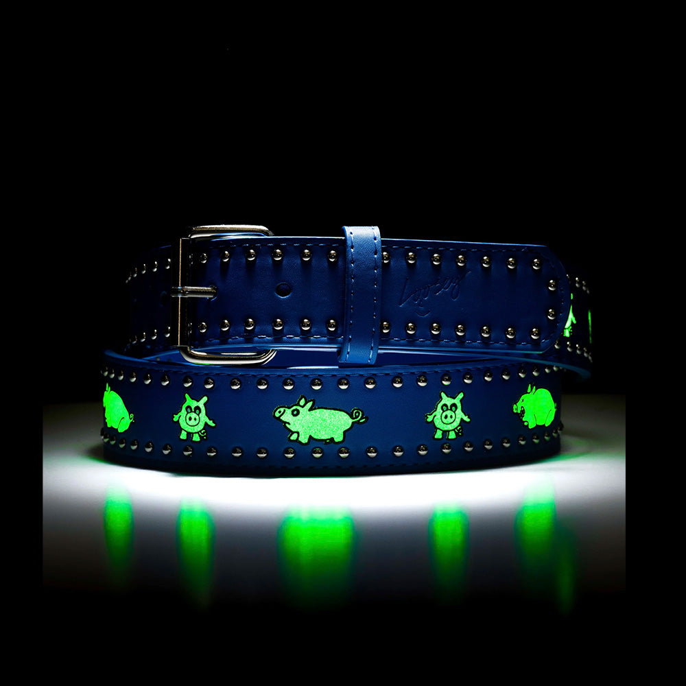 Frank Villani belts are back! Blue faux leather with silver rivets. Glow in the dark printed pigs drawn by Franky with debossed Loosey logo.