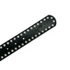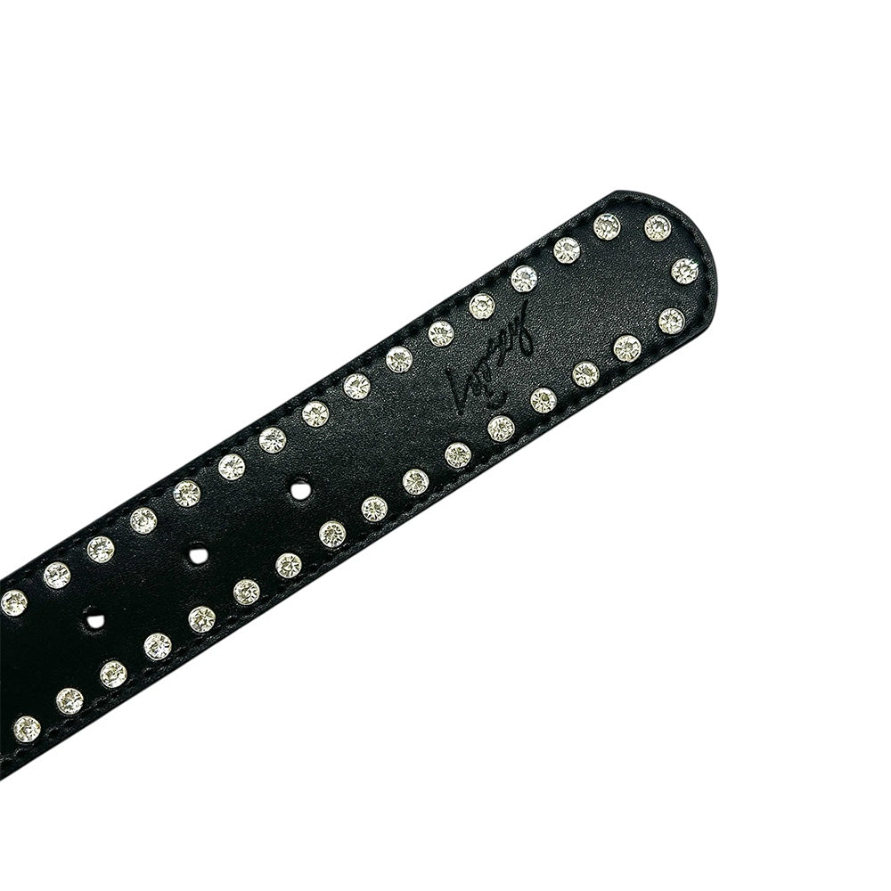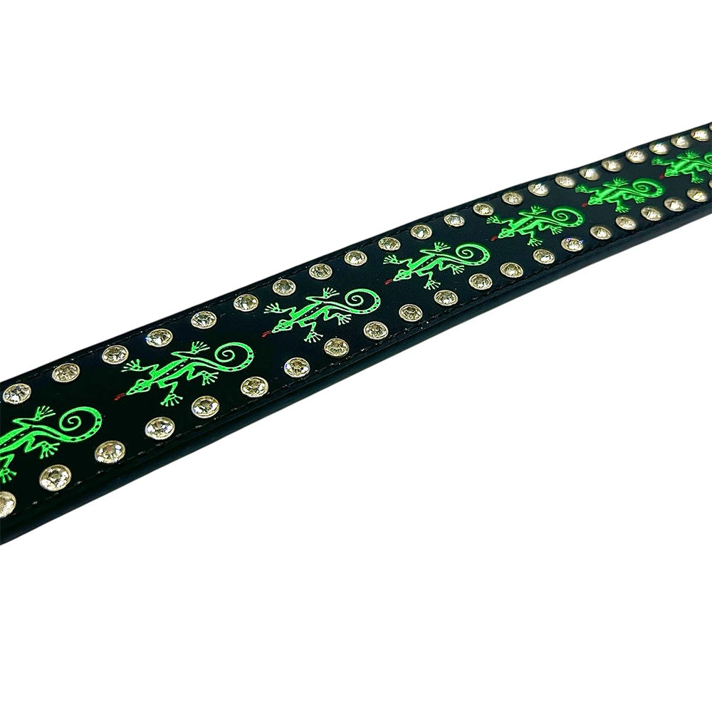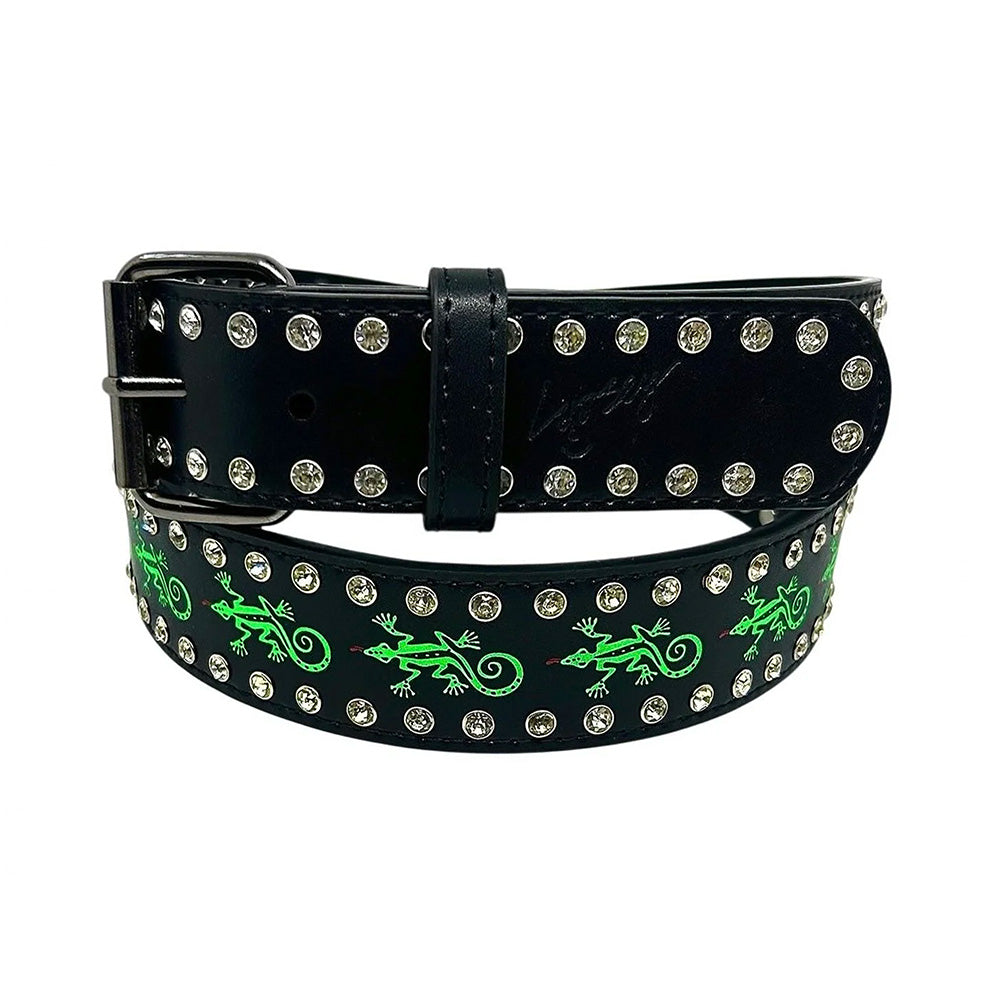 Black faux leather belt with shiny silver rhinestones and printed gecko graphic.