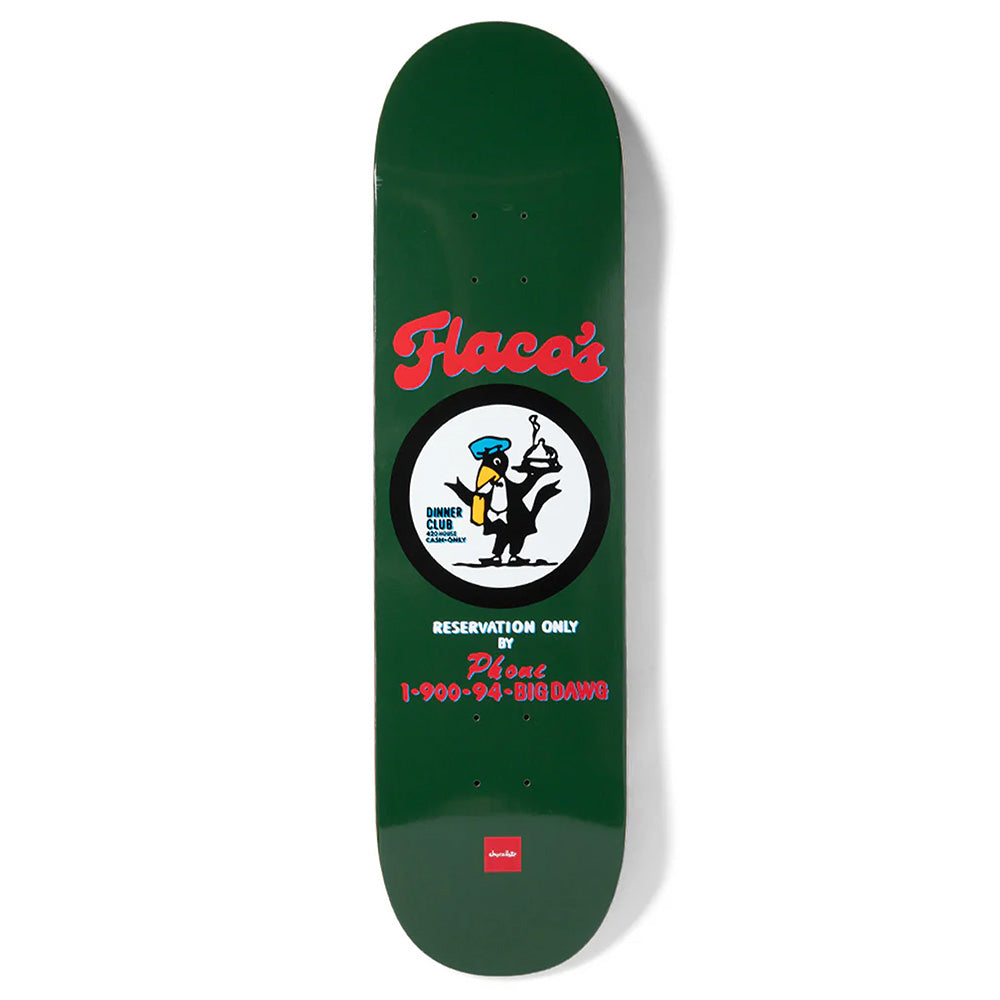CHOCOLATE PEREZ FLACO'S7.75" WIDTH31.125" LENGTH13.82" WHEELBASESHAPE: G009 8.4" WIDTH32" LENGTH14.25" WHEELBASESHAPE: G059