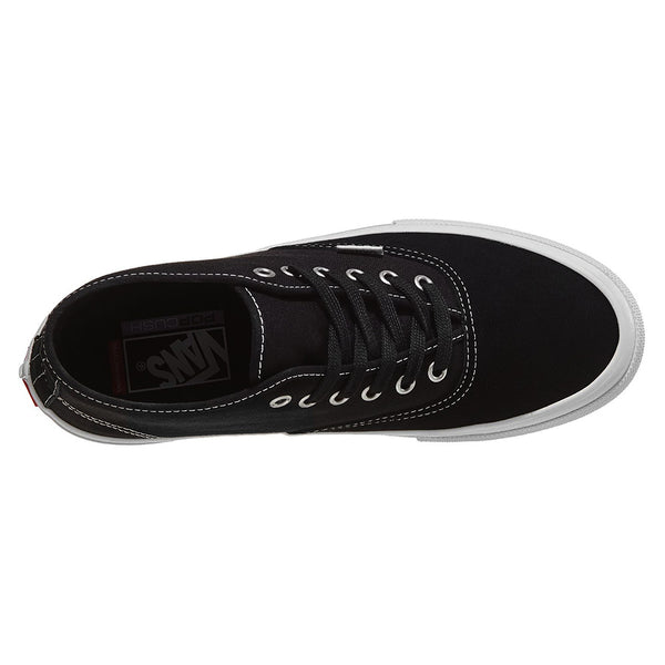 • The VANS SKATE CURREN CAPLES BLACK / WHITE sneaker features a black low-top design with white laces, stitching, and sole, plus POPCUSH insoles. Shown in side profile against a plain background. The VANS SKATE CURREN CAPLES BLACK / WHITE sneakers feature white soles, white laces, visible stitching, and POPCUSH insoles, shown against a plain light background.