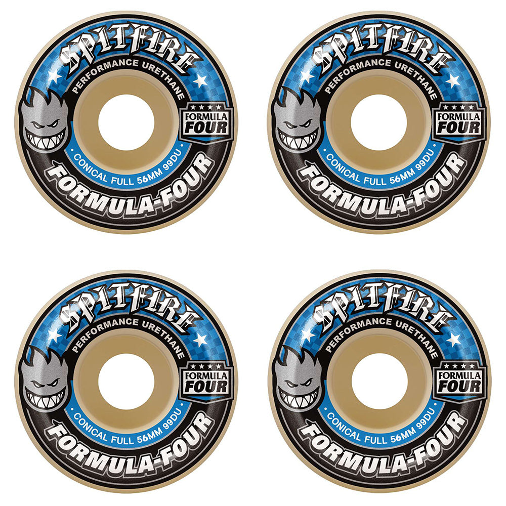 SPITFIRE WHEELS FORMULA FOUR CONICAL FULL 99D 56MMa wider version of the conical shape. Wide riding surface, cut in sidewalls to decrease weight. A solid, controllable shape for all terrains.